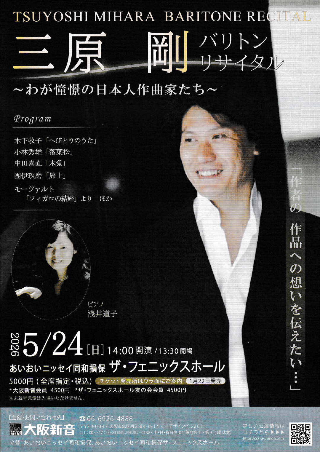 | 料金 | 一般 5000円 大阪新音会員 4500円(全席座席指定 税込) 主催:大阪新音 協賛:あいおいニッセイ同和損保、あいおいニッセイ同和損保ザ・フェニックスホール |